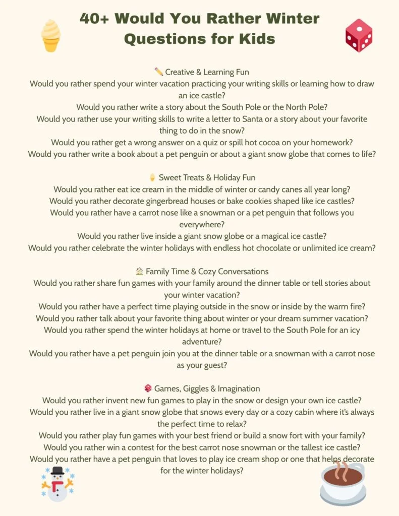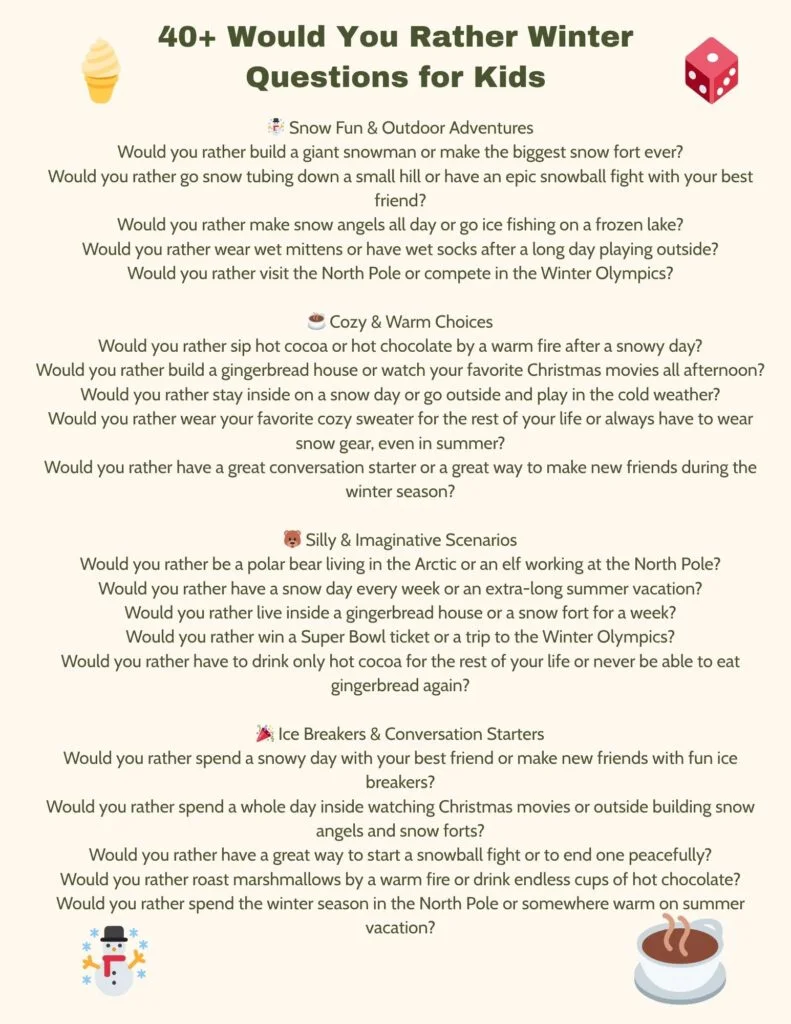 Winter is the perfect time for laughter, snowball fights, and cozy nights by the fire! Whether you’re enjoying a snow day, sipping hot cocoa, or watching your favorite Christmas movies, these ‘Would You Rather’ questions are a great way to spark fun conversations. We’ve even included a free PDF printable.