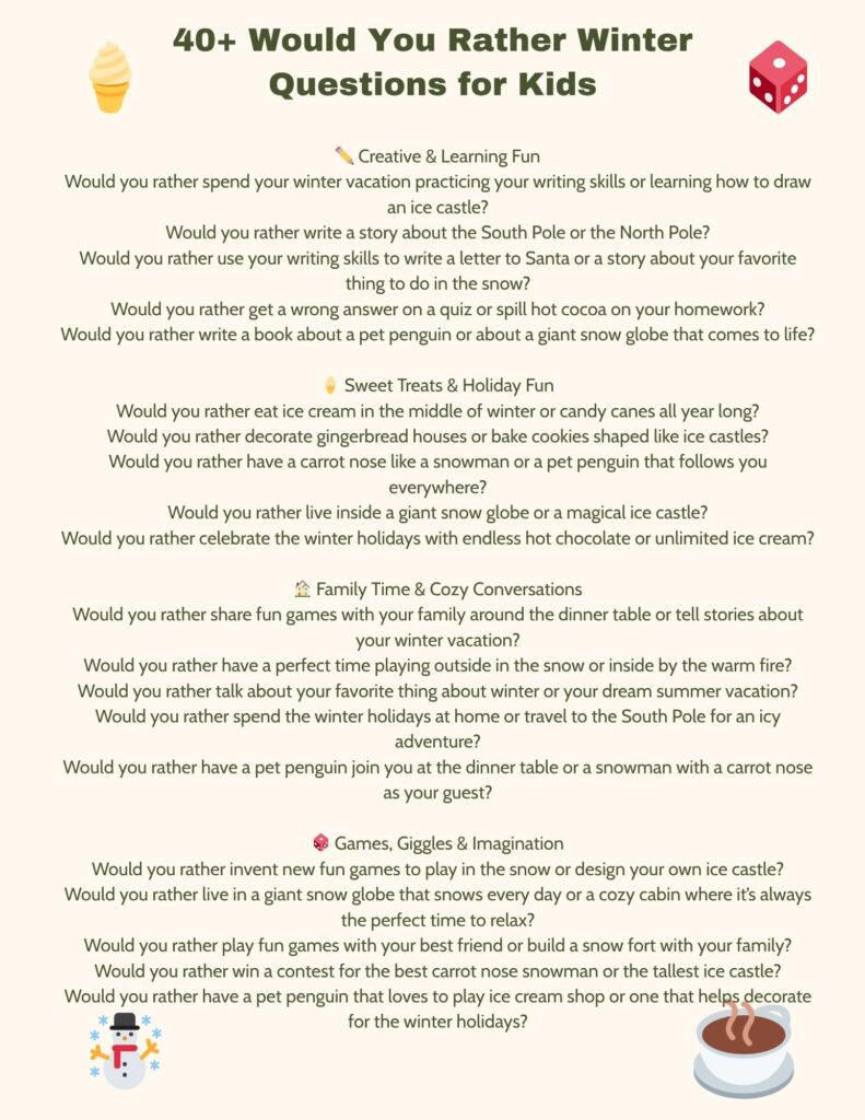Winter is full of magic, laughter, and cozy moments — from building snowmen with carrot noses to sipping hot cocoa by a warm fire. These Would You Rather winter questions are a great way to make memories, spark giggles, and start conversations with family and friends.